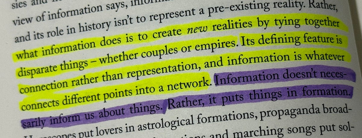 Harari flips the lens: information’s job is to link things, not just describe them. Stories, data, and symbols pull individuals into networks: