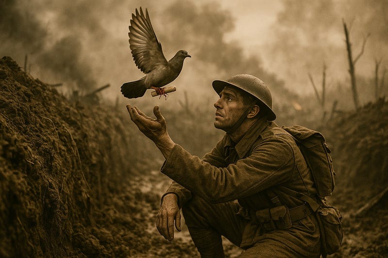 The bird arrives, half-blind and bleeding. The guns go quiet, and the battalion lives. Ink on a scrap of paper, flown by feathers, became life-or-death information.